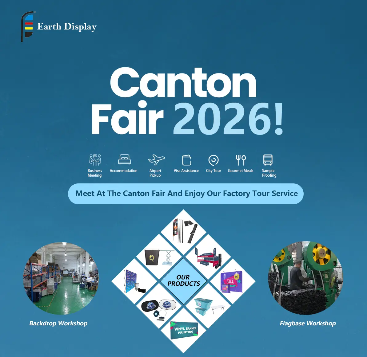 Приближается Кантонская ярмарка 2026 года, и мы в Earth Display очень надеемся увидеть вас там. Мы изготавливаем флаги из перьев, всплывающие фоны, основы для флагов, виниловые баннеры на заказ — практически все, что угодно для выставок и рекламы — уже более десяти лет. На этот раз вместо того, чтобы просто общаться онлайн, мы хотим показать вам, чем мы занимаемся, лицом к лицу.